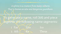 After performing remarkably in playtests, I've put out yet another generator, this time for sphinxes. More generators will be coming, as these are super fun and easy to make, and I love how easily the...